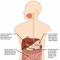 Nutrients are absorbed in the small intestine and waste is prepared for elimination in the large intestine.