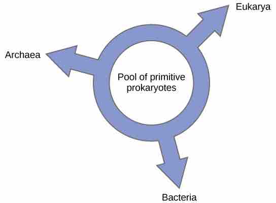 According to the "ring of life" phylogenetic model, the three domains of life evolved from a pool of primitive prokaryotes.