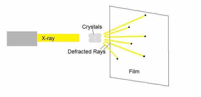 This process reveals the geometry of the atoms within the molecules. The x-ray beams are diffracted in a characteristic pattern that gives rise to reflections, dark spots on the detector which represent places where constructive interference of the diffracted light has occurred. The detector records the reflections on a two-dimensional surface. The crystal is typically rotated with respect to different axes and shot again with X-rays, so that diffraction patterns from all angles of the X-rays hitting the crystal are recorded.