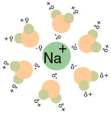 Water molecules (gray/green is hydrogen, orange is oxygen) surround a sodium cation in a solution. Notice the negative dipole or the oxygen molecules are 'facing' the Na+.