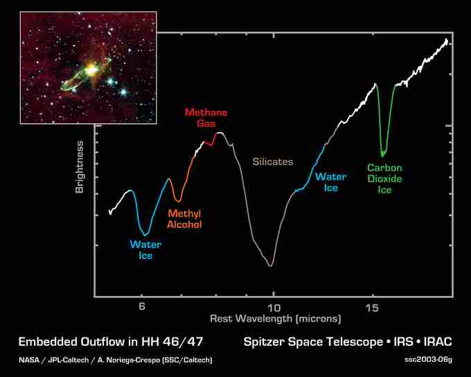 NASA's Spitzer Space Telescope has lifted the cosmic veil to see an otherwise hidden newborn star, while detecting the presence of water and carbon dioxide ices, as well as organic molecules. The Spitzer image (inset) was obtained with the infrared array camera. The primary image shows a spectrum obtained with Spitzer's infrared spectrograph instrument, stretching from wavelengths of 5.5 microns to 20 microns. Spectra are graphical representations of a celestial object's unique blend of light. Characteristic patterns, or fingerprints, within the spectra allow astronomers to identify the object's chemical composition.