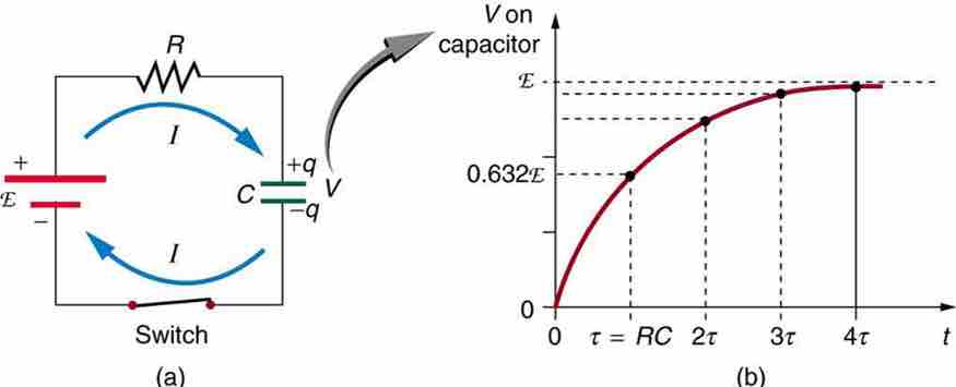 (a) An RC circuit with an initially uncharged capacitor. Current flows in the direction shown as soon as the switch is closed. Mutual repulsion of like charges in the capacitor progressively slows the flow as the capacitor is charged, stopping the current when the capacitor is fully charged and Q=C⋅emf. (b) A graph of voltage across the capacitor versus time, with the switch closing at time t=0. (Note that in the two parts of the figure, the capital script E stands for emf, q stands for the charge stored on the capacitor, and τ is the RC time constant. )