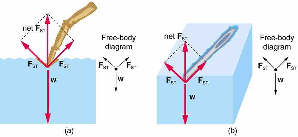 Force diagrams showing the direction of forces for water supporting a water strider (insect) foot and a pin. In both cases, the vertical component of the surface tension is enough to support the weight of the object.
