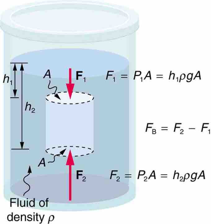 In the previous section, we calculated the buoyancy force on a cylinder (shown in ) by considering the force exerted on each of the cylinder's sides. Now, we'll calculate this force using Archimedes' principle. The buoyancy force on the cylinder is equal to the weight of the displaced fluid. This weight is equal to the mass of the displaced fluid multiplied by the gravitational acceleration: