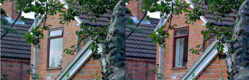 Photograph taken of a window with a camera polarizer filter rotated to two different angles. In the picture at left, the polarizer is aligned with the polarization angle of the window reflection. In the picture at right, the polarizer has been rotated 90° eliminating the heavily polarized reflected sunlight.