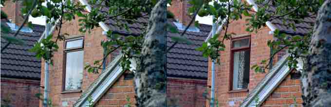 Photograph taken of a window with a camera polarizer filter rotated to two different angles. In the picture at left, the polarizer is aligned with the polarization angle of the window reflection. In the picture at right, the polarizer has been rotated 90° eliminating the heavily polarized reflected sunlight.