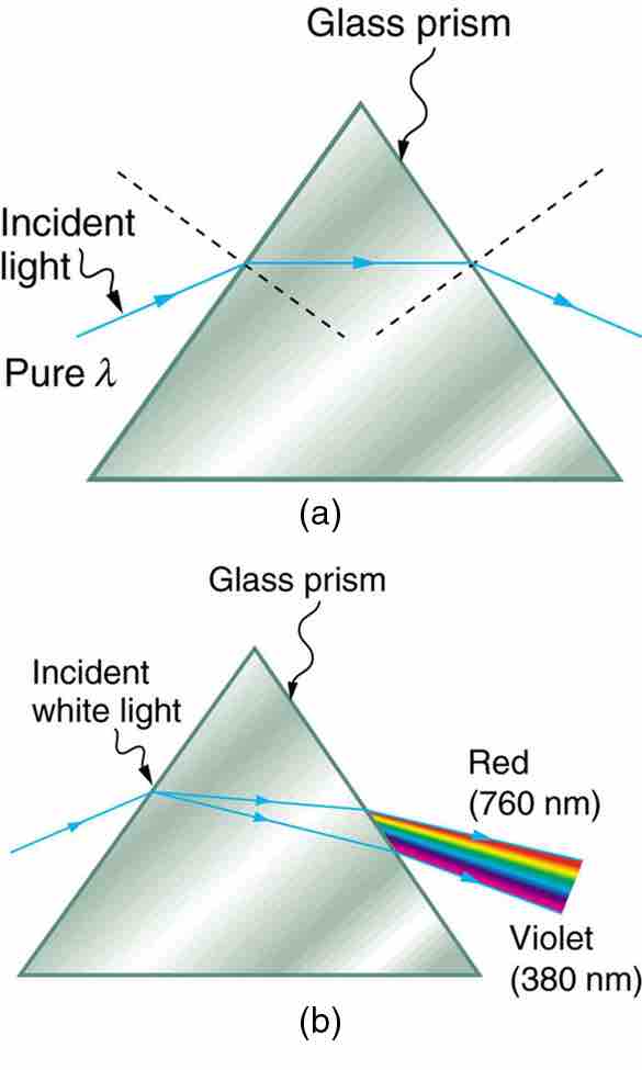 (a) A pure wavelength of light falls onto a prism and is refracted at both surfaces. (b) White light is dispersed by the prism (shown exaggerated). Since the index of refraction varies with wavelength, the angles of refraction vary with wavelength. A sequence of red to violet is produced, because the index of refraction increases steadily with decreasing wavelength.
