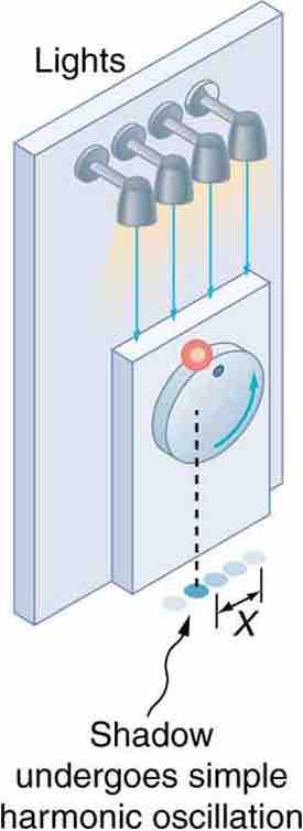 The shadow of a ball rotating at constant angular velocity ω on a turntable goes back and forth in precise simple harmonic motion.