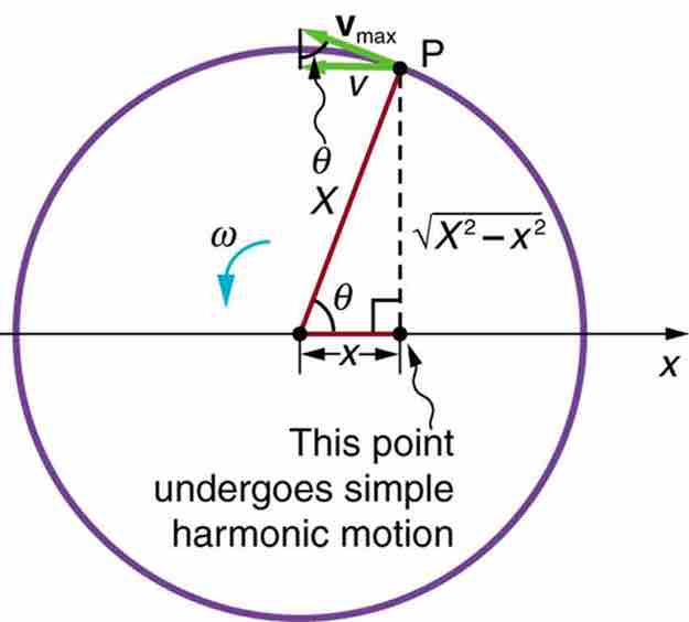 A point P moving on a circular path with a constant angular velocity ω is undergoing uniform circular motion. Its projection on the x-axis undergoes simple harmonic motion. Also shown is the velocity of this point around the circle, v−max, and its projection, which is v. Note that these velocities form a similar triangle to the displacement triangle.