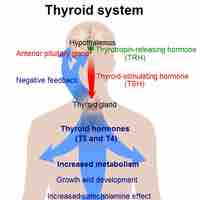 The production of thyroxine and triiodothyronine is regulated by thyroid-stimulating hormone (TSH) that is released from the anterior pituitary.